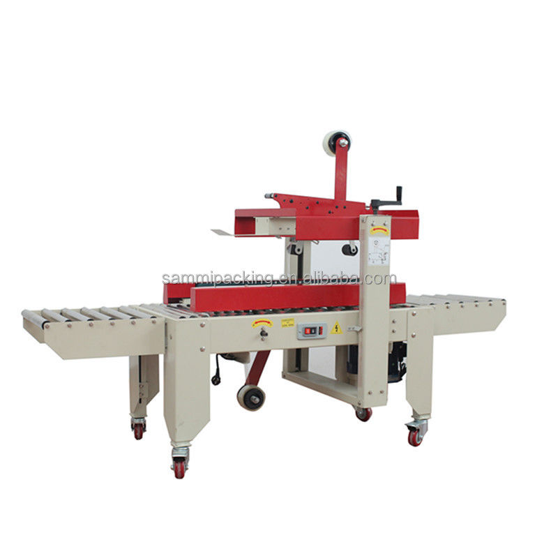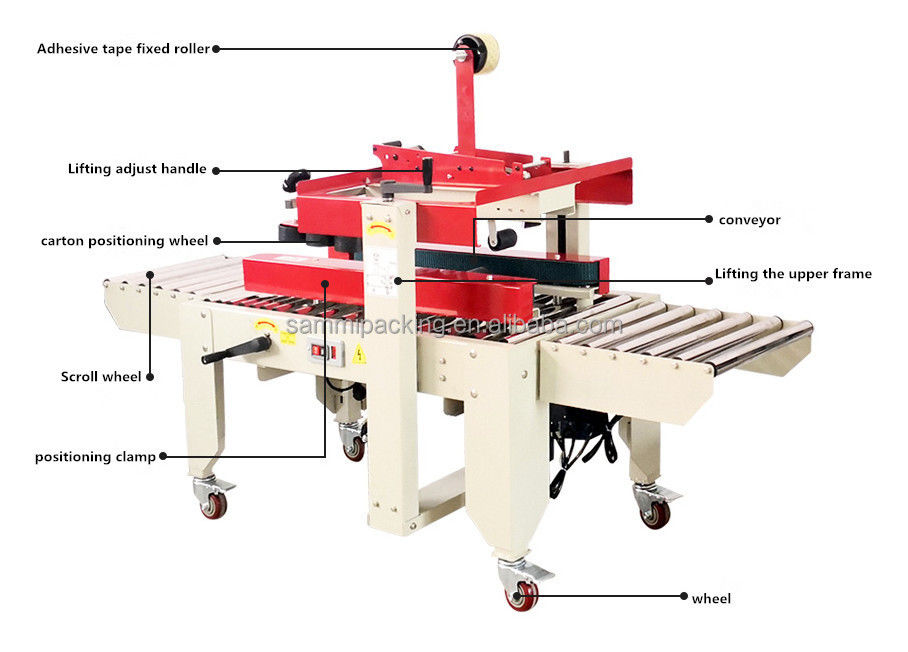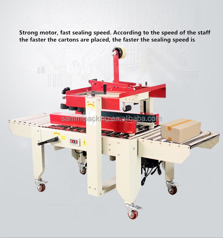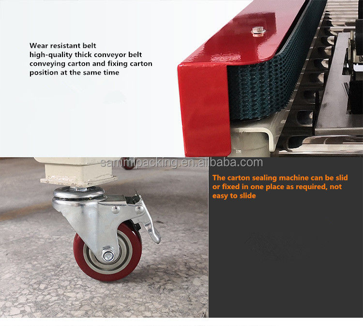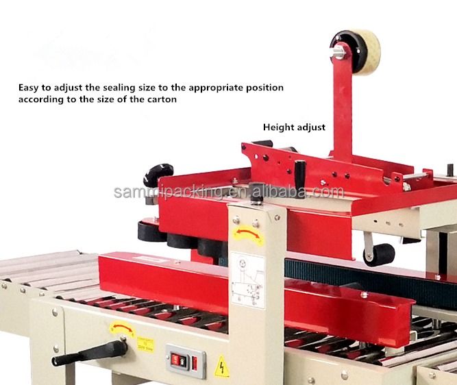 2.ضبط ارتفاع الختم والعرض يدويا وفقا لحجم الكرتون، ثم وضع الكرتون على طاولة العمل، وسيتم نقل الكرتون من خلال وتختم مع الشريط تلقائيا في نفس الوقت.
